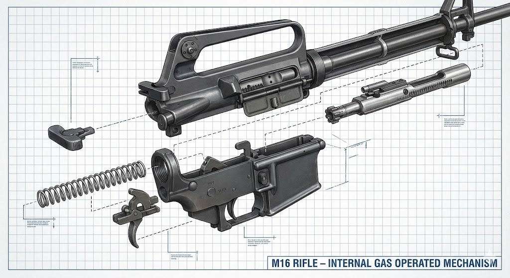 M16 rifle menggunakan sistem gas-operated yang memanfaatkan gas hasil tembakan untuk menggerakkan bolt. Mekanisme ini memungkinkan siklus tembak berjalan halus dan konsisten. Rotating bolt membantu memastikan penguncian yang kuat sebelum peluru ditembakkan.